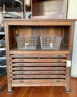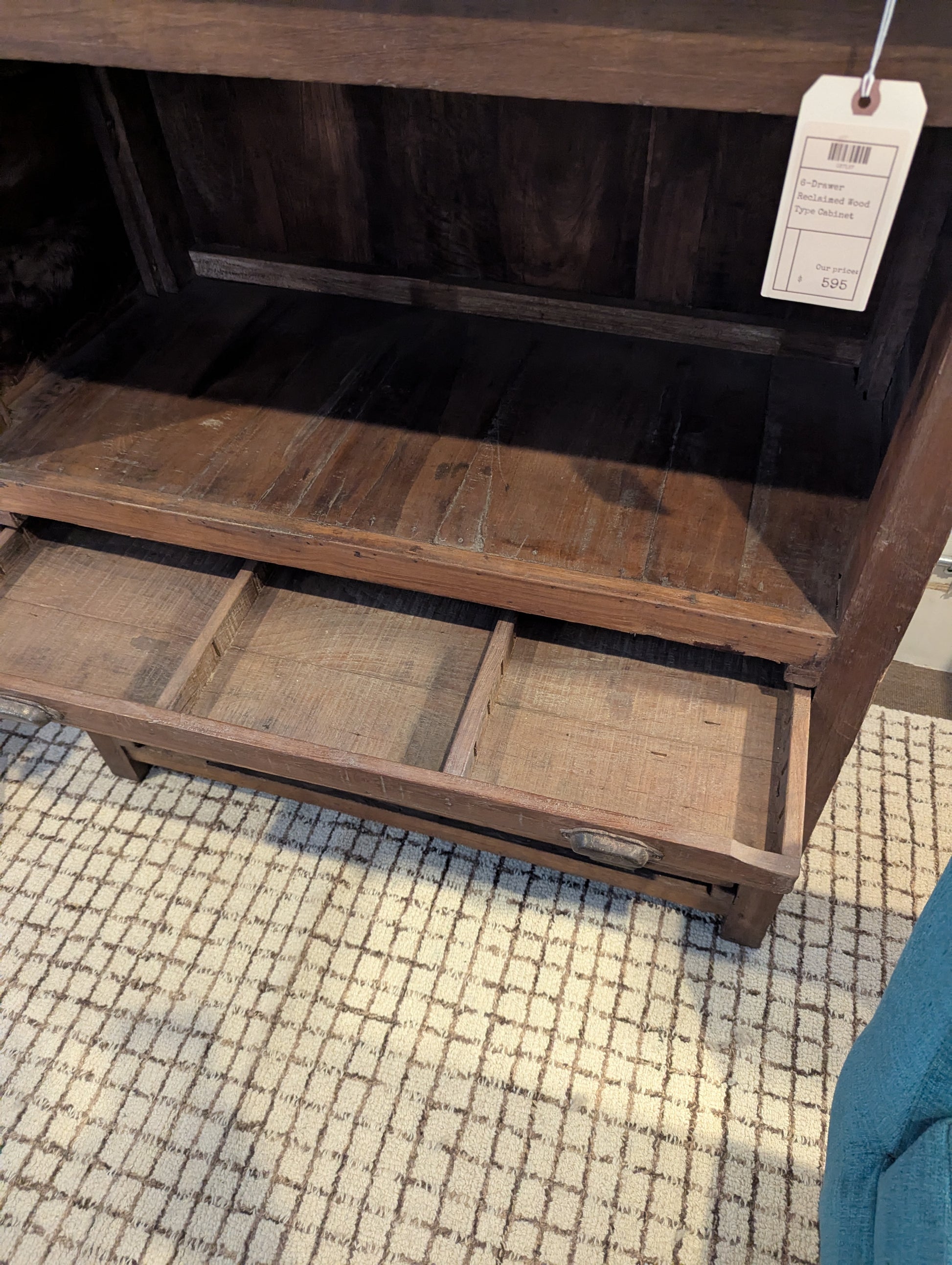 6 reclaimed type drawers with the smaller dividers removed (see second photo), plus an open shelf above make for versatile storage and display.