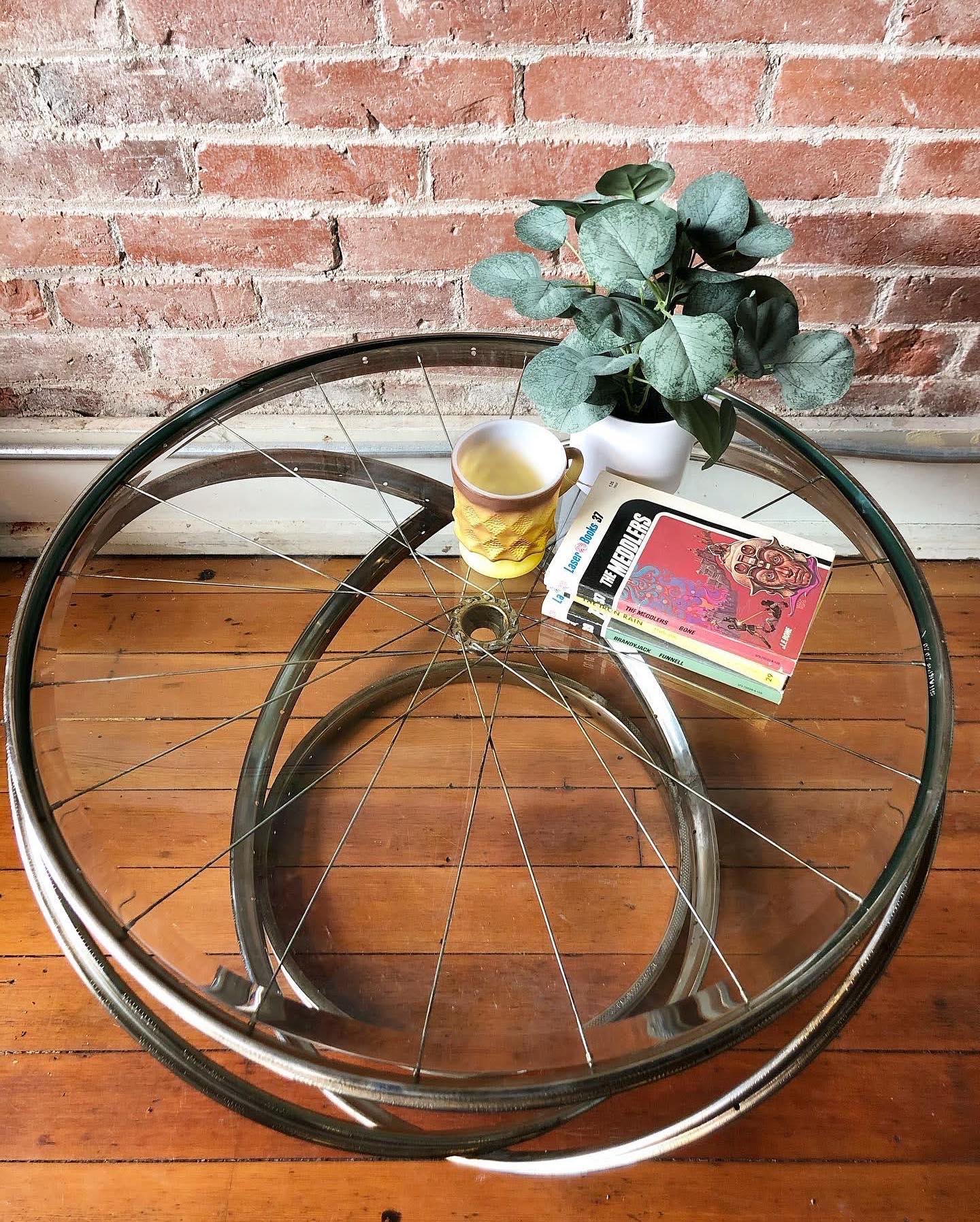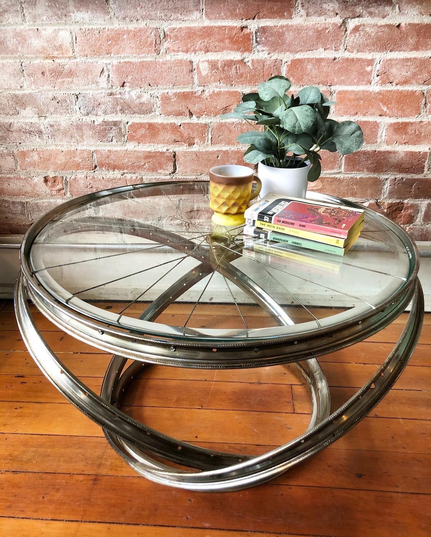 Putting the cycle back in upcycle. ๐ This reclaimed bicycle wheel coffee table is a clever conversation piece. Metal frame with a hefty glass top.