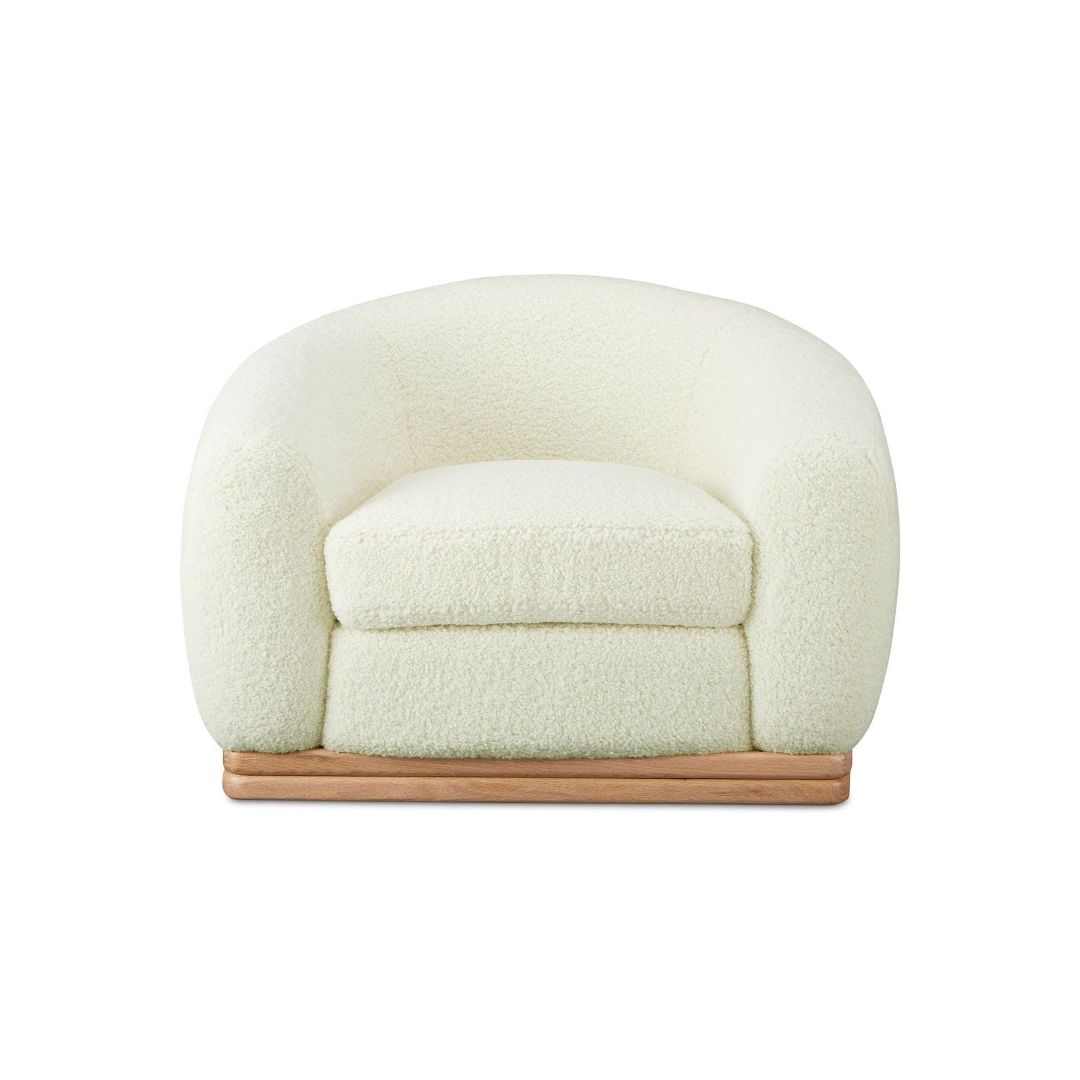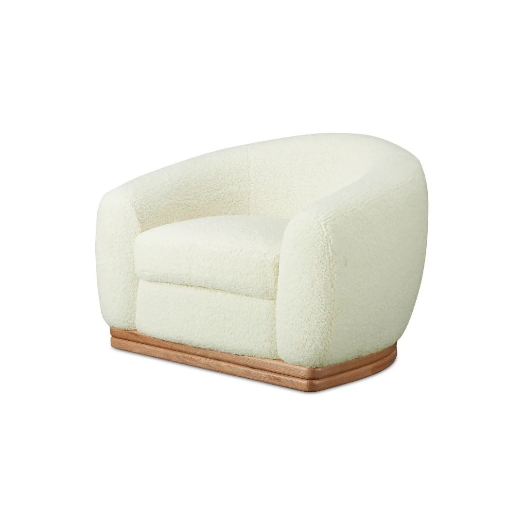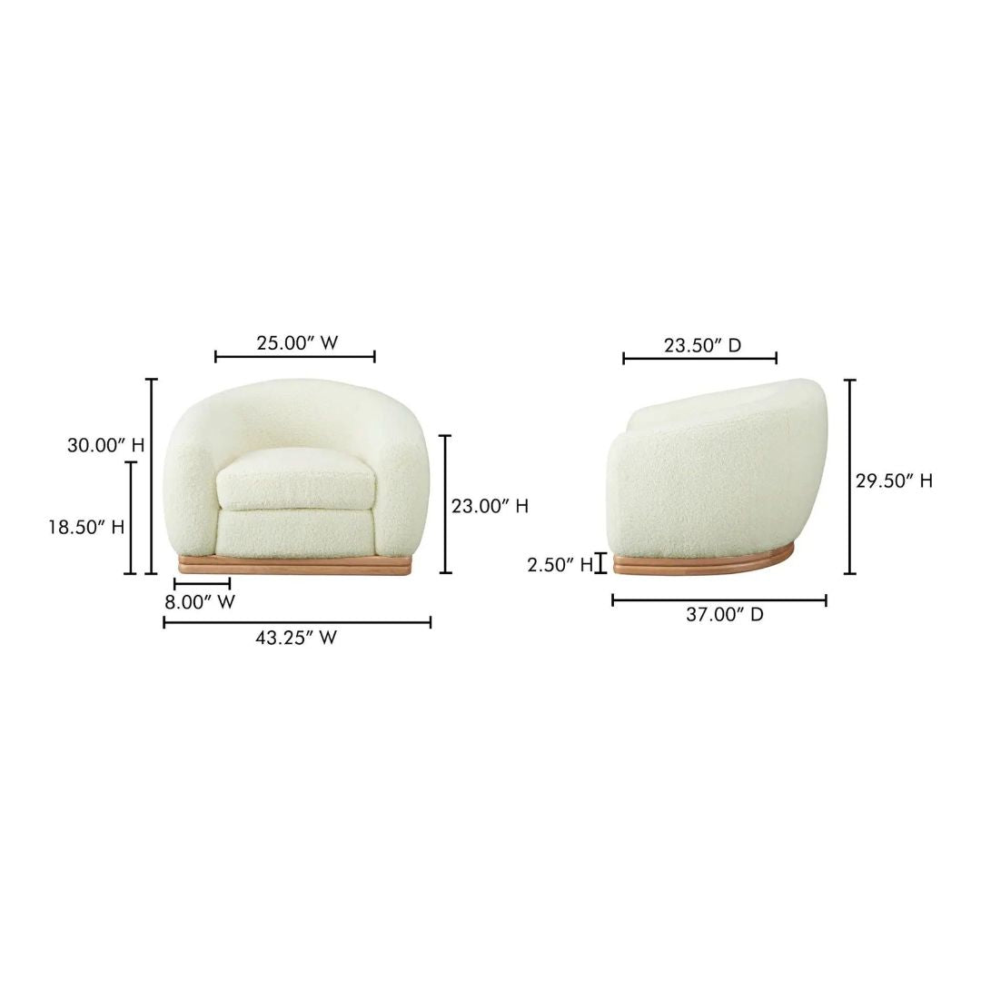 With its curved back and exaggerated proportions, the Marlowe lounge chair offers an enveloping sanctuary that is cozy and contemporary. The tiered rubber wood base adds visual interest as a contrast to the oversized seat. Soft faux shearling fabric adds a touch of elegance to a statement piece that brings both comfort and sophistication.